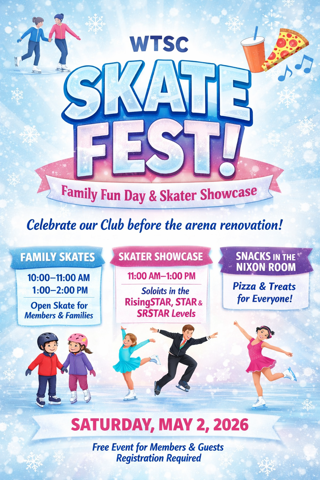 This is a great opportunity to celebrate our skaters, families, and club community, and to enjoy time on the ice together before the arena renovations begin.